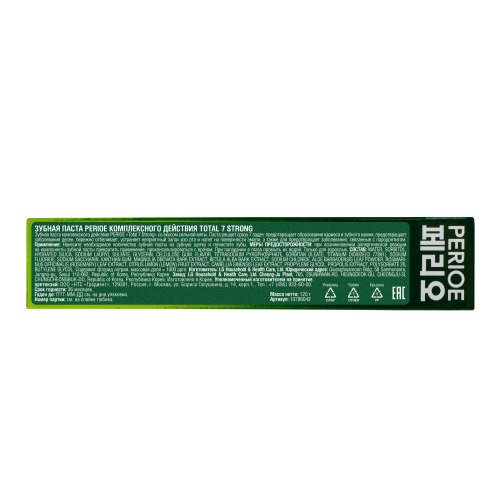 Зубная паста комплексного действия Perioe “Total 7 Strong” со вкусом сильной мяты. Паста решает сразу 7 задач: предотвращает образование кариеса и зубного камня, предотвращает заболевания десен, бережно отбеливает, устраняет неприятный запах изо рта и налет на поверхности эмали, а также для профилактики заболеваний, связанных с пародонтитом.
