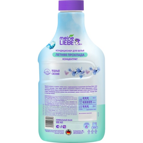 Meine Liebe представляет обновленную серию средств для стирки высшей категории. В серии парфюмерных кондиционеров для белья использованы специальные смягчающие компоненты и премиальные европейские отдушки. Многослойная цветочная композиция каждого кондиционера Meine Liebe подобрана таким образом, чтобы мягкий аромат сохранялся на одежде и белье надолго после стирки. Ощутите мягкость и свежесть летнего ветра с парфюмированным кондиционером для белья Meine Liebe «Летняя прохлада». Ноты сердца аромата раскрываются нежностью цветка апельсинового дерева, прохладой морского бриза и мягкостью фиалки, создавая аромат цветущего летнего сада после каждой стирки. Кондиционер смягчает волокна ткани, разглаживает, снимает статический заряд, сохраняет цвет и структуру волокон. Пользуйтесь нашими средствами, и мы позаботимся о вашем времени, бытовой технике и одежде так же, как вы заботитесь о своих близких. Мы стремимся сделать вашу ежедневную стирку, уборку и мытьё посуды максимально простыми и приятными, чтобы вы всегда были довольны результатом. Бытовая химия Meine Liebe безопасна для домов с автономными канализациями (септиками). Все средства Meine Liebe изготовлены по уникальной формуле под контроль качества компании Grunlab (Германия), что гарантирует их надежность и эффективность.