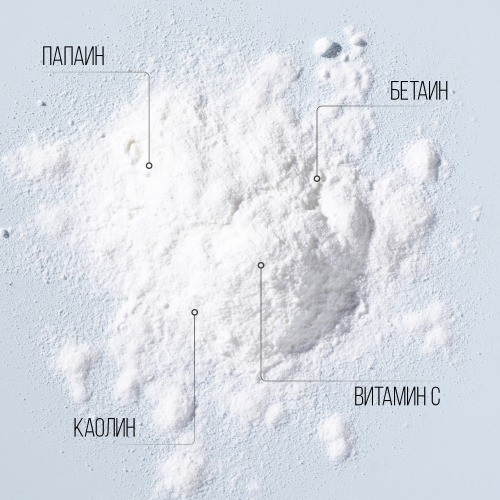 АКТИВНЫЕ КОМПОНЕНТЫ: папаин (энзим), витамин С, каолин, бетаин. РЕЗУЛЬТАТ: Глубокое очищение, сияющая кожа, ровный тон, суженные поры. ОСОБЕННОСТИ ПРОДУКТА: Деликатно и глубоко очищает кожу. Мягко отшелушивает ороговевшие клетки. Ускоряет регенерацию. Освежает цвет лица - сияние кожи. Выравнивает тон. Антиоксидантное действие - предотвращает преждевременное старение кожи. Делает кожу гладкой, мягкой, бархатистой уже после первого применения. Дарит ощущение фарфоровой кожи –убирает жирный блеск, визуально сужает поры. Выравнивает тон. Усиливает действие дальнейшего ухода. Безопасность, абсолютно не травмирует кожу. Очищение происходит максимально бережно. Пудра не механически стирает верхний слой, а растворяет его благодаря энзимамам. Не сушит и не стягивает кожу. Отсутствуют отдушки. ТИП КОЖИ: Подходит для всех типов кожи: как для сухой кожи, так и для кожи, склонной к воспалениям. СПОСОБ ПРИМЕНЕНИЯ: Уникальная текстура пудры позволяет использовать продукт 4-мя способами: Мягкая пенка. Полирующий пилинг-скраб: за счет мелкодисперсной текстуры абсолютно не травмирует кожу. Маска-пилинг: держать на лице в течение 3-5 минут. Энзимная добавка в продукт очищения. Не рекомендуется использовать пудру при псориазе, нейродермите и т.д. Лёгкий купероз не является противопоказанием. Если купероз сильно выражен, необходимо избегать попадания пудры на такие участки кожи.